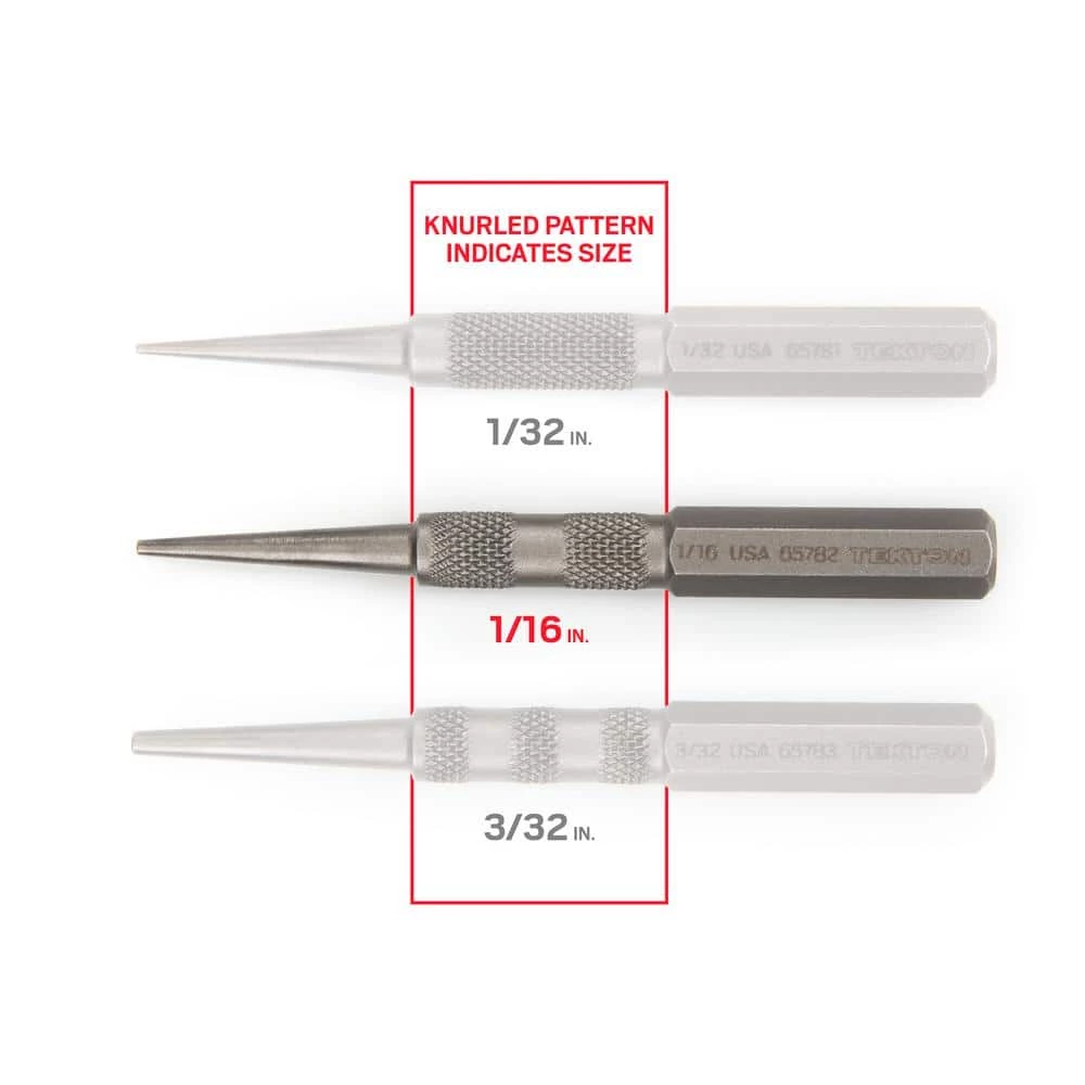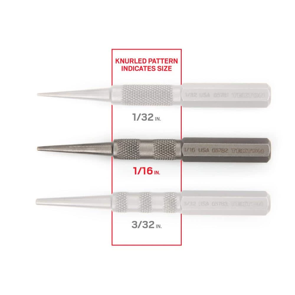 Put the final touches on molding, trim, furniture, and cabinetry using TEKTON Nail Sets. Designed to engage with nail heads, a dimpled tip resists slipping off so you can neatly countersink finishing nails below wood surfaces without scratching or denting them. For quick size selection, the nonslip fingergrip section has a knurled pattern that indicates the tip size. Each punch is made from premium high-carbon steel that’s machined from a single piece of 3/8-in. hex stock and protected by a dry-touch, rust-preventative coating.