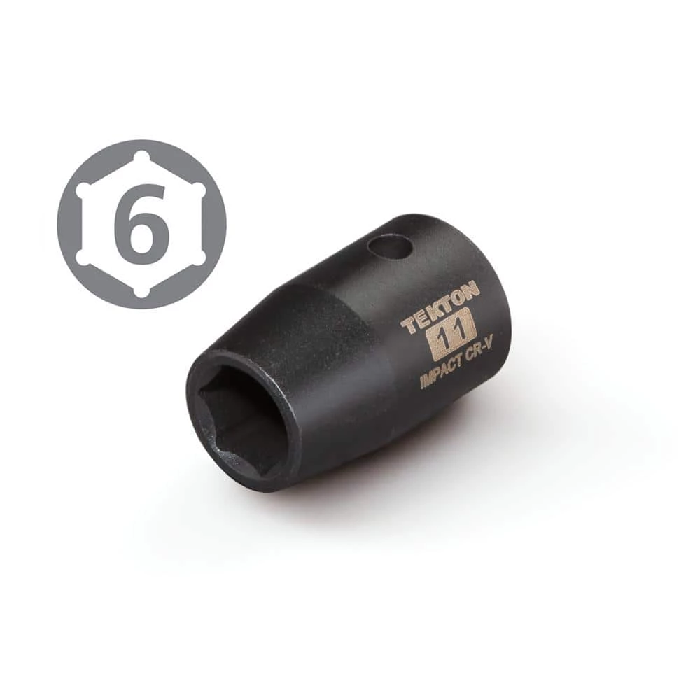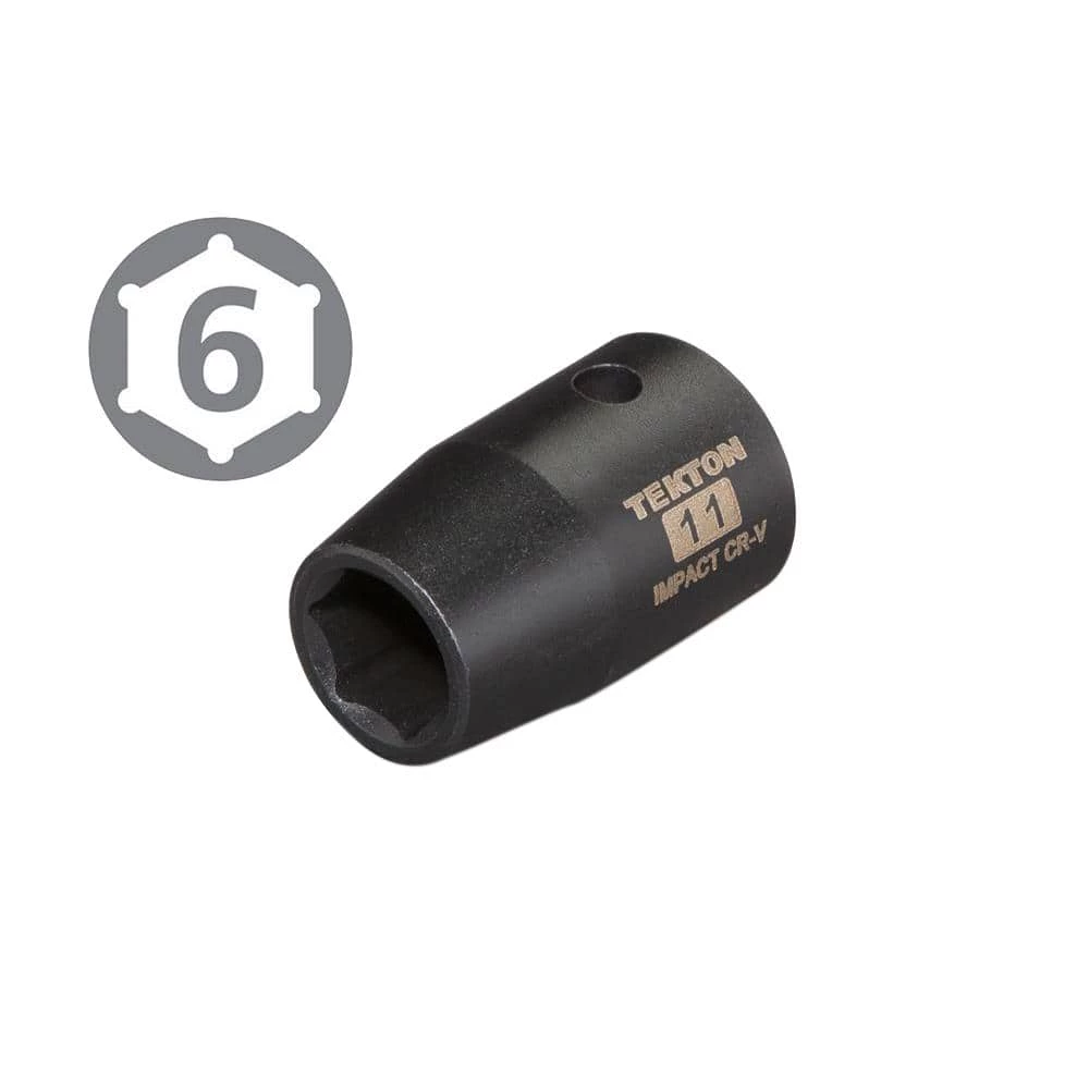 The TEKTON 1/2 in. Drive x 11 mm Impact Socket is engineered for use with impact drivers. It has a 6-point opening that snugly fits the hex shape of fastener heads, allowing it to apply maximum torque without slipping. To prevent round-off under stress, it grips the flat sides of fastener heads rather than the corners. Easy to read even in low light, the large, high-contrast size marking is permanently laser etched into the steel surface. The through-hole in the drive end locks onto the tang of impact wrenches or drivers so it won’t fall off or stick on fastener heads. To protect against rust and corrosion, the black phosphate finish absorbs and holds oil, repelling moisture.