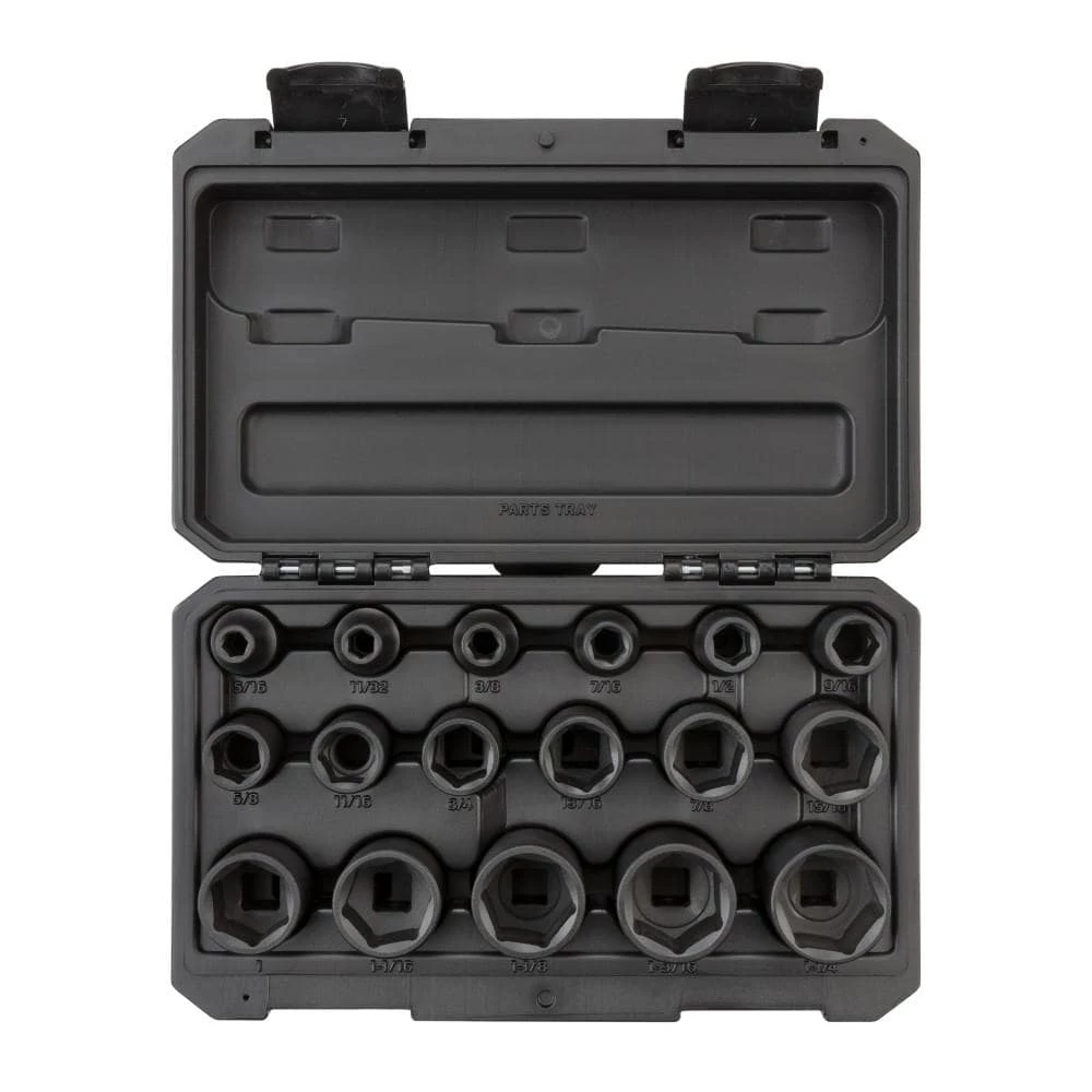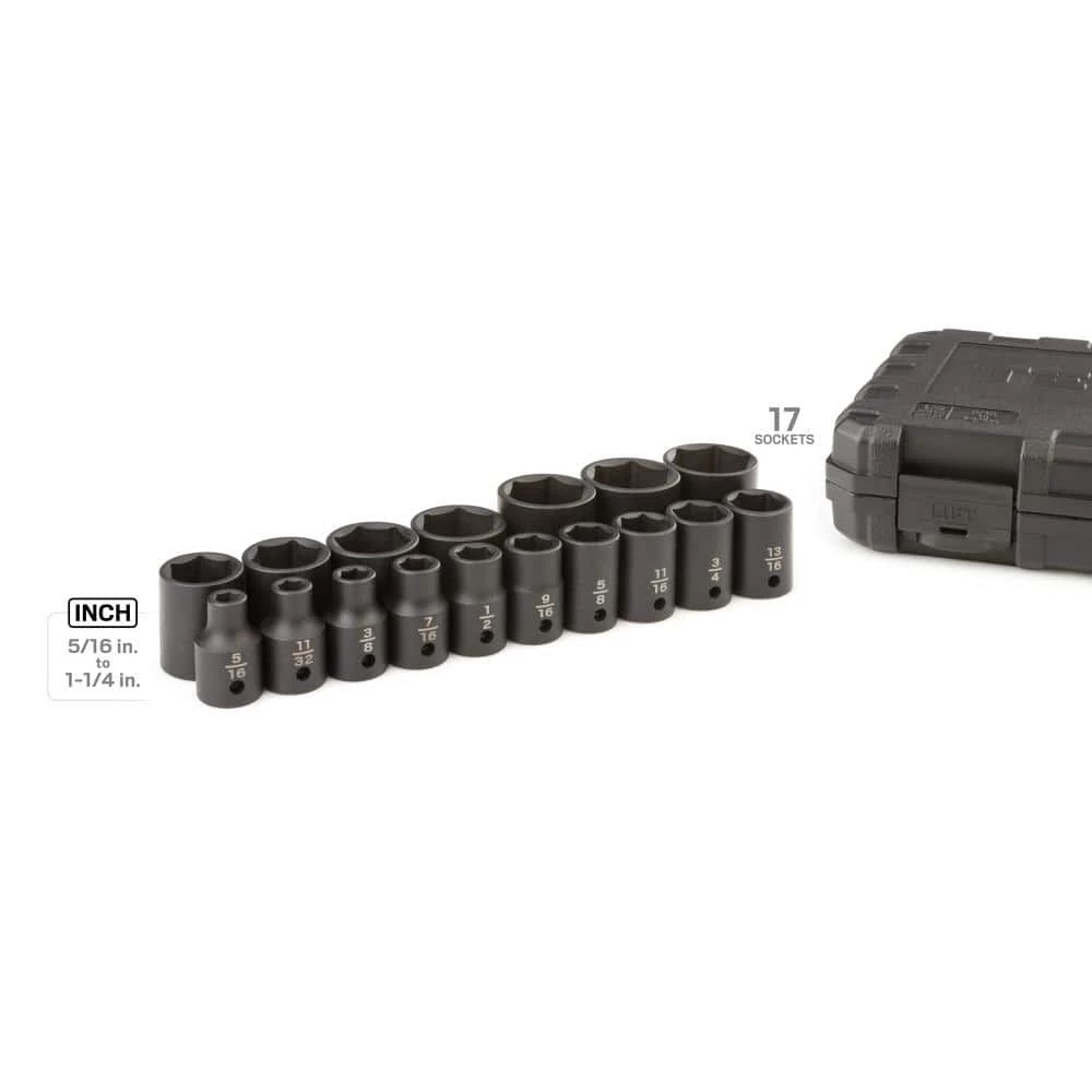 - 17-pieces, 1/2 in. drive 6-point impact sockets: 5/16 in., 11/32 in., 3/8 in., 7/16 in., 1/2 in., 9/16 in., 5/8 in., 11/16 in., 3/4 in., 13/16 in., 7/8 in., 15/16 in., 1 in., 1-1/16 in., 1-1/8 in., 1-3/16 in., 1-1/4 in.
