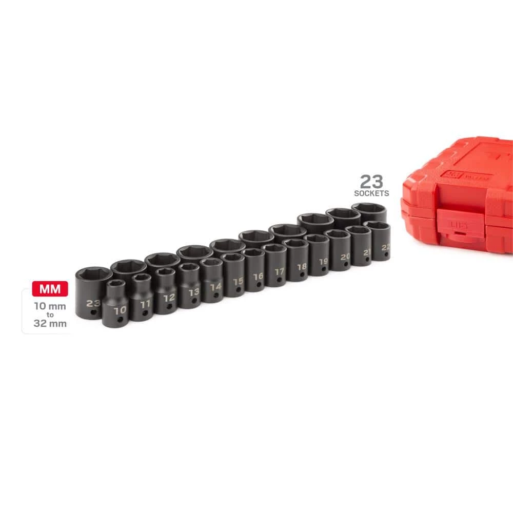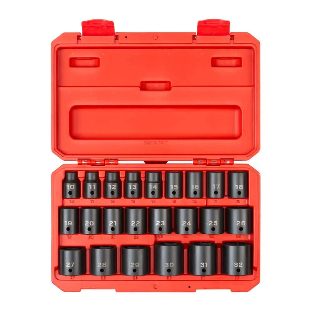 - 23-pieces, 1/2 in. drive 6-point impact sockets: 10 mm, 11 mm, 12 mm, 13 mm, 14 mm, 15 mm, 16 mm, 17 mm, 18 mm, 19 mm, 20 mm, 21 mm, 22 mm, 23 mm, 24 mm, 25 mm, 26 mm, 27 mm, 28 mm, 29 mm, 30 mm, 31 mm, 32 mm