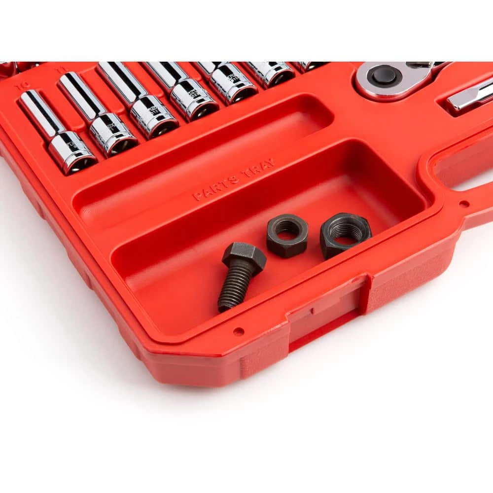 The TEKTON 1/2 in. Drive 6-Point Socket and Ratchet Set includes every socket from 3/8 in. to 1 in. and 10 mm to 24 mm with no skipped sizes. The set comes equipped with a 90-Tooth quick-release ratchet as well as a universal joint and extension, which aren’t often found in most sets. All of the tools come stored in a sturdy carrying case. The 6-point socket openings are ideal for working with hex-shaped fasteners and designed to grip the sides and not the corners of the fastener heads, preventing round-off. An extended length allows the deep socket to fit over long fasteners and reach into recessed areas. The large, die-stamped markings are permanently impressed into the material and optimized for readability. A mirror chrome-plated finish protects against corrosion and easily wipes clean.