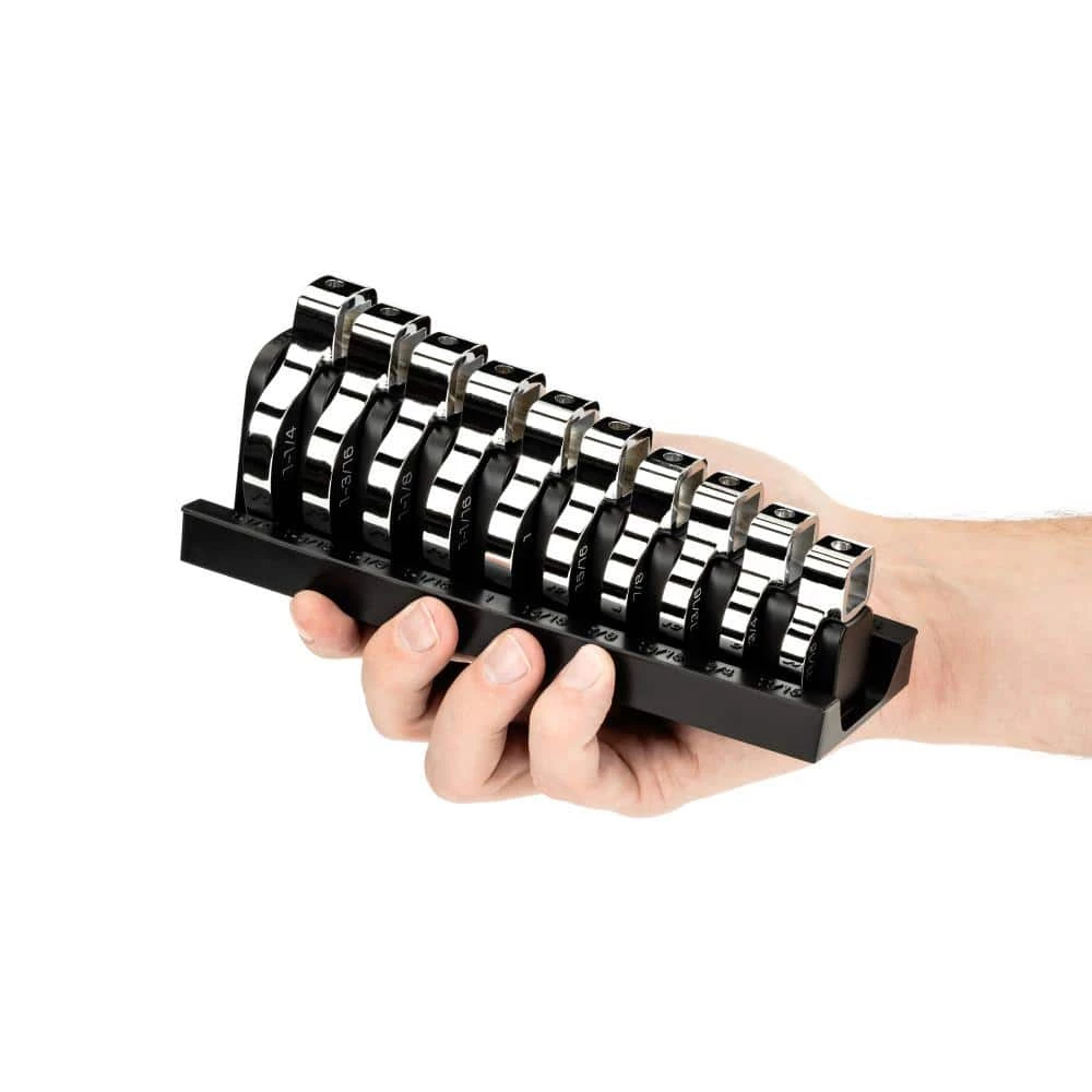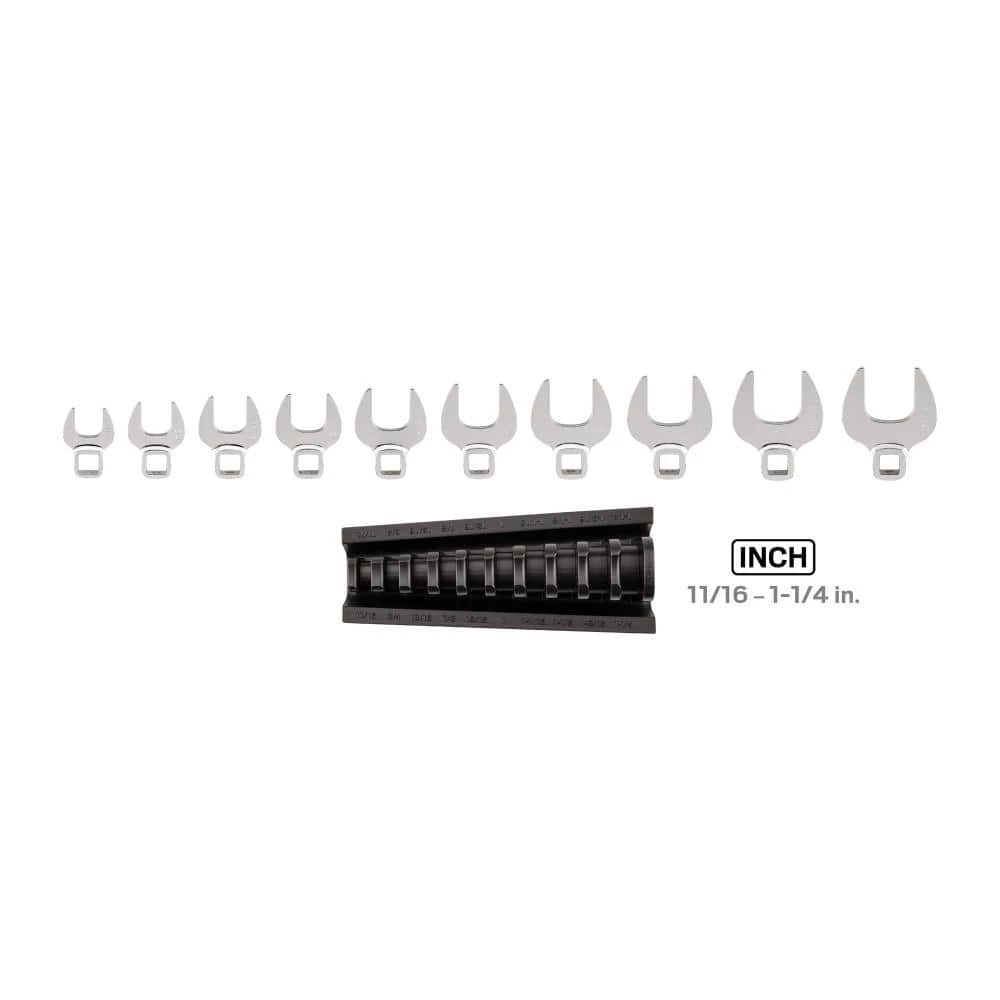 - 10-pieces, crowfoot wrenches: 11/16 in., 3/4 in., 13/16 in., 7/8 in., 15/16 in., 1 in., 1-1/16 in., 1-1/8 in., 1-3/16 in., 1-1/4 in.
