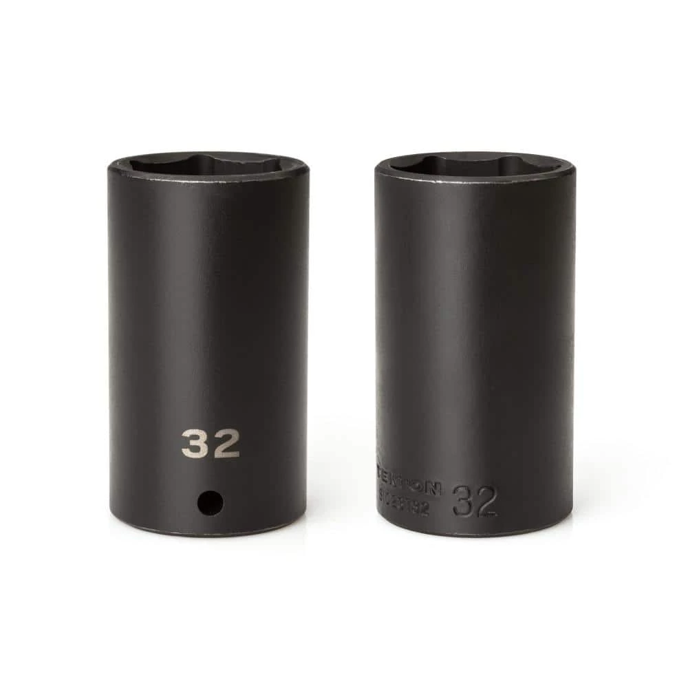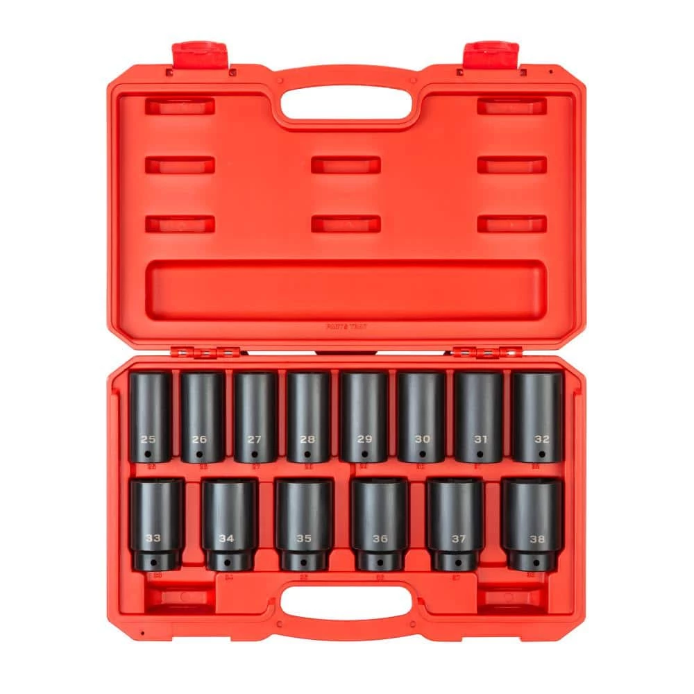 - 14-pieces, 1/2 in. drive deep 6-point impact sockets: 25 mm, 26 mm, 27 mm, 28 mm, 29 mm, 30 mm, 31 mm, 32 mm, 33 mm, 34 mm, 35 mm, 36 mm, 37 mm, 38 mm