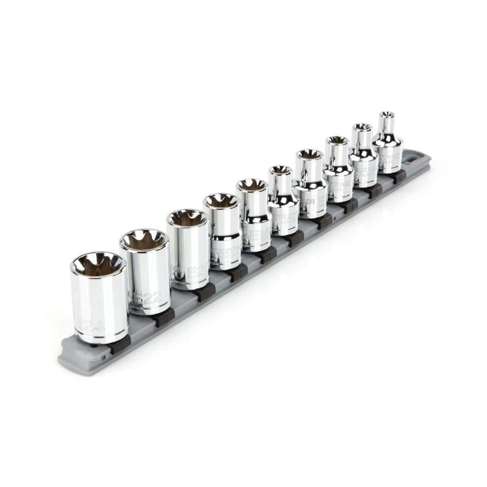 - 10-piece 1/2 in. drive external star sockets: E8, E10, E11, E12, E14, E16, E18, E20, E22, E24