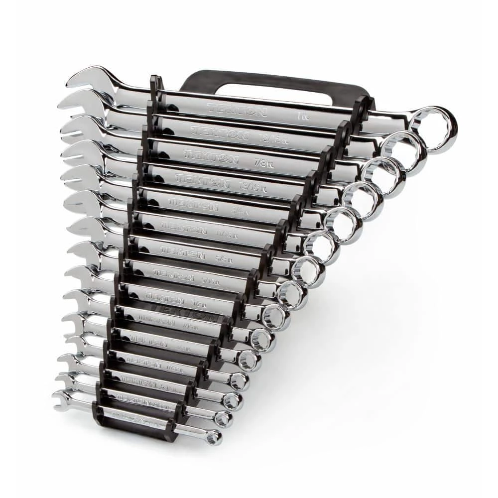 The TEKTON 15-pc. Combination Wrench Set is a complete series of every size from 1/4 to 1 inch. Classically lean and quietly refined, TEKTON Combination Wrenches provide a sure fit on fasteners and multiple options for working around obstructions or in tight spaces. To reduce the working swing arc, the open end is angled 15 degrees so the wrench can be flipped over with each rotation to engage the fastener twice as often. The 12-point box end doubles the access angles of a 6-point. It’s offset 15 degrees, creating clearance for your fingers and extra space to slide past whatever might be in the way. To prevent round-off, it contacts and applies force to the flat sides of fastener heads rather than the corners. The wrenches are compactly organized in the Store-and-Go Wrench Keeper. This versatile storage solution has a folding handle that saves drawer space and nonslip grippers that lock wrenches securely in place when you’re on the move.