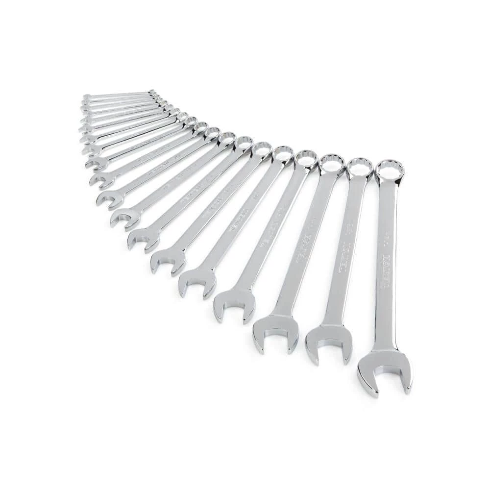 The TEKTON 19-piece Combination Wrench Set is a complete in. set with every size from 1/4 in. – 1-1/4 in. Open end is angled 15° and the box end is designed to grip flat sides of fastener heads, not corners, to prevent round-off. Polished chrome plating protects against corrosion and wipes clean to a mirror finish. Always Guaranteed.