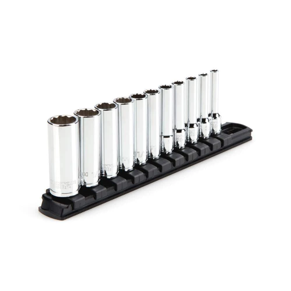 - 11-piece 1/4 in. drive deep 12-point sockets: 5/32 in., 3/16 in., 7/32 in., 1/4 in., 9/32 in., 5/16 in., 11/32 in., 3/8 in., 7/16 in., 1/2 in., 9/16 in.