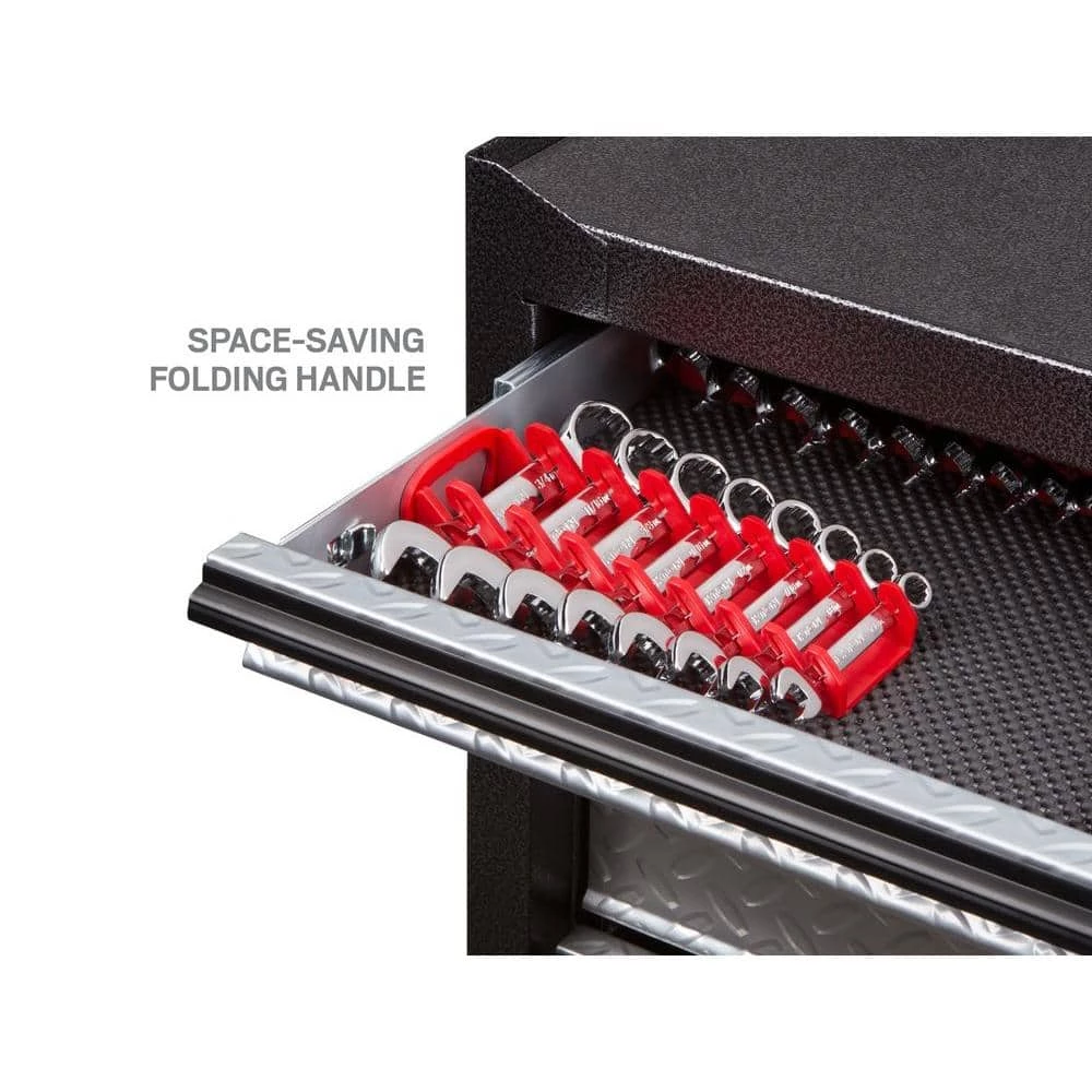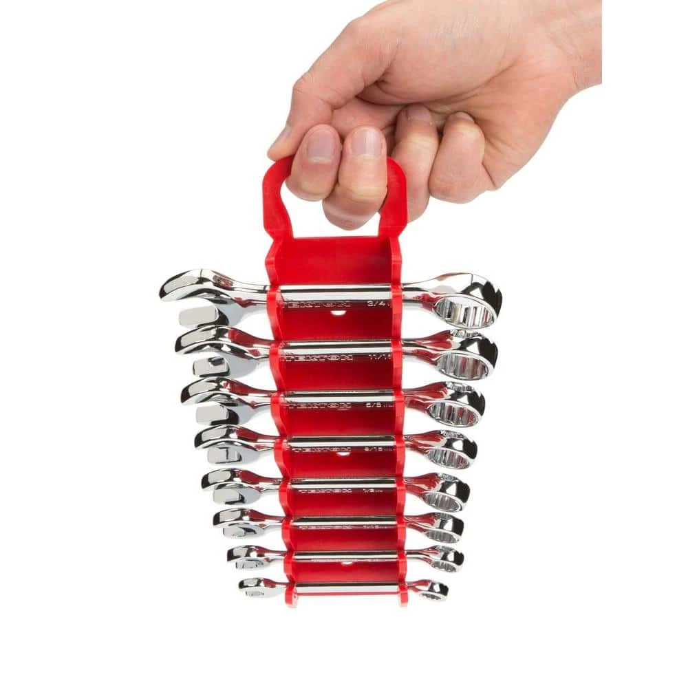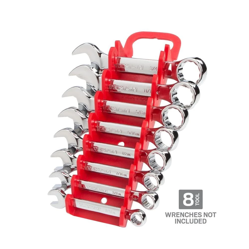 While most tool holders have limited functionality, the TEKTON 8-Tool Store-and-Go Stubby Wrench Keeper is a toolbox drawer organizer and a secure carrier that goes with you. Designed to save space, it has a foldaway handle and a lean, low profile that fits shallow drawers. Made from a specially formulated polymer, it offers the right balance of a nonslip grip on wrenches and the flexibility to easily remove them with one hand. Though its narrow width is designed for the shorter length of stubby wrenches, the gripper teeth are universally sized to fit the cross-section of each corresponding wrench, making the keeper a possible solution for wrenches of any length. Resistant to fuels, lubricants, solvents, and most common chemicals, the Store-and-Go Stubby Wrench Keeper cannot rust, is nearly unbreakable, and does not have any sharp edges that could scratch or damage tools.