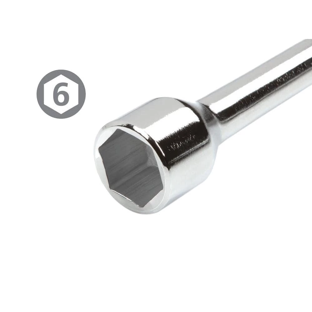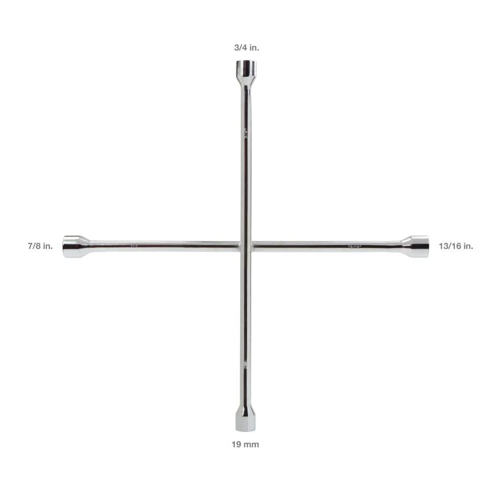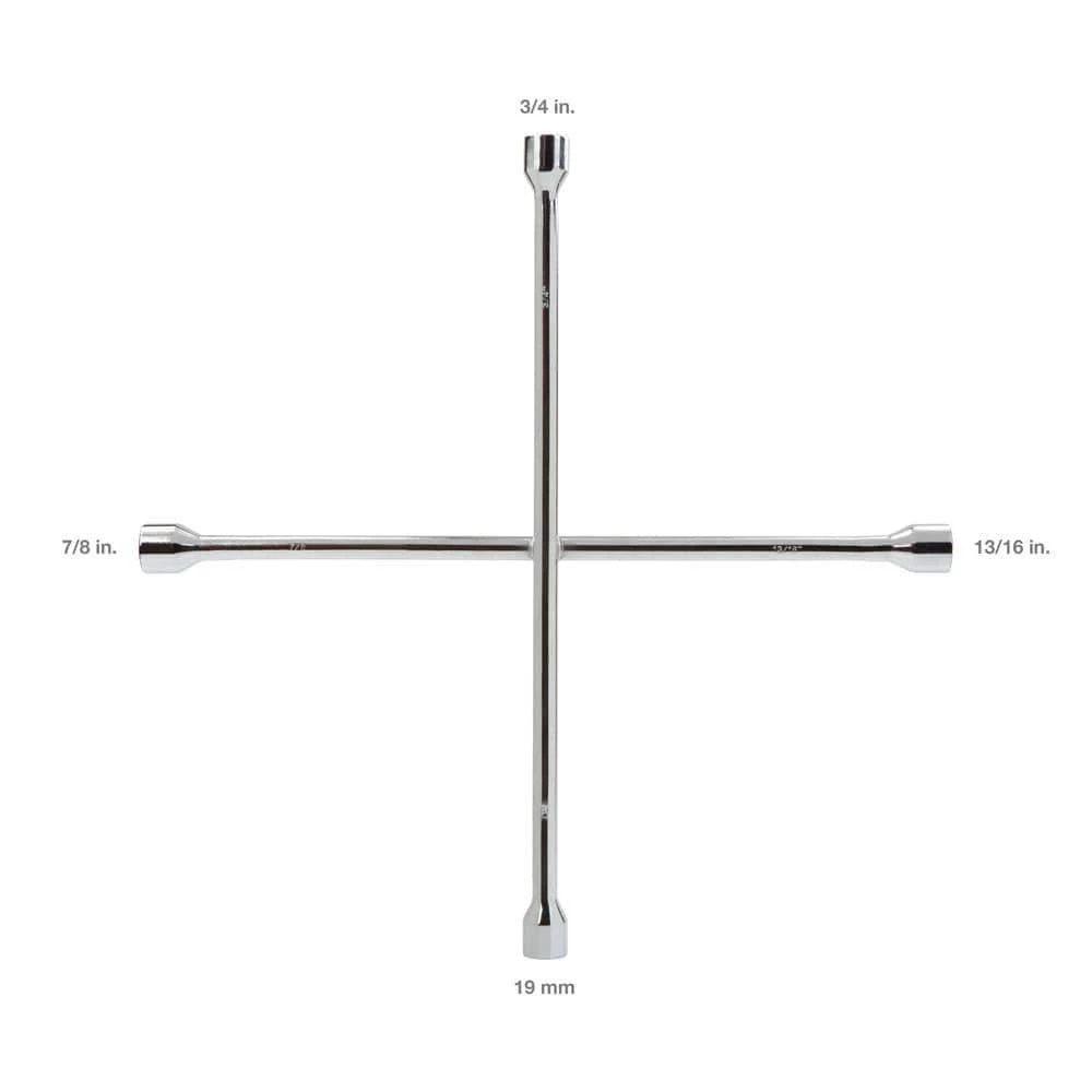 With four common sizes (3/4, 13/16, 7/8 in., and 19 mm), the TEKTON 20-inch 4-Way Lug Wrench is an essential addition to your vehicle’s roadside service kit. Its classic welded-cross design allows for two-handed leverage to break loose the most stubborn lug nuts, so nothing will stop you from getting back on the road. The cross design is also naturally balanced to quickly spin nuts on and off long threaded studs, saving you valuable time. Six-point openings snugly fit hex-shaped lug nuts and help prevent slipping, especially when they’re worn or rusted. The openings are designed to grip the flat sides of nuts, not the corners, to prevent round-off.