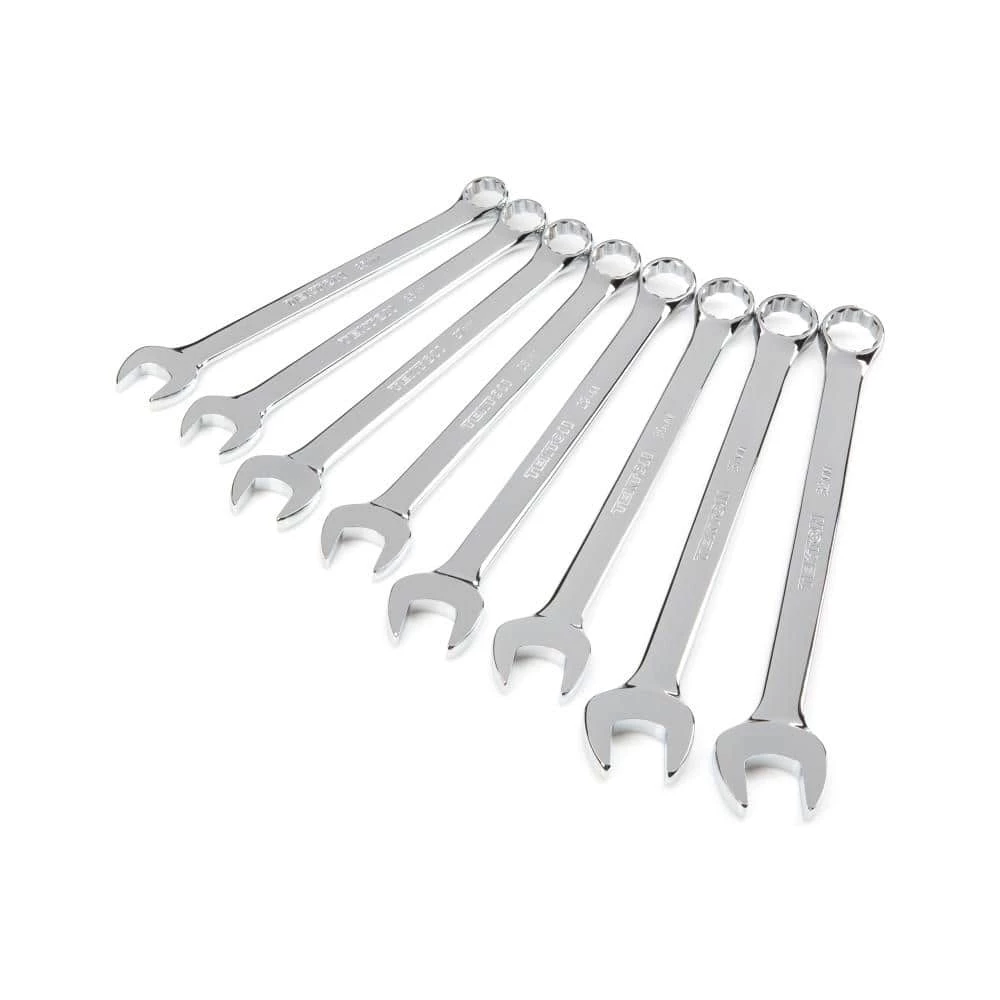 The TEKTON 8-piece Combination Wrench Set is a complete metric set with every size from 25 mm – 32 mm. Open end is angled 15° and the box end is designed to grip flat sides of fastener heads, not corners, to prevent round-off. Polished chrome plating protects against corrosion and wipes clean to a mirror finish. Always Guaranteed.