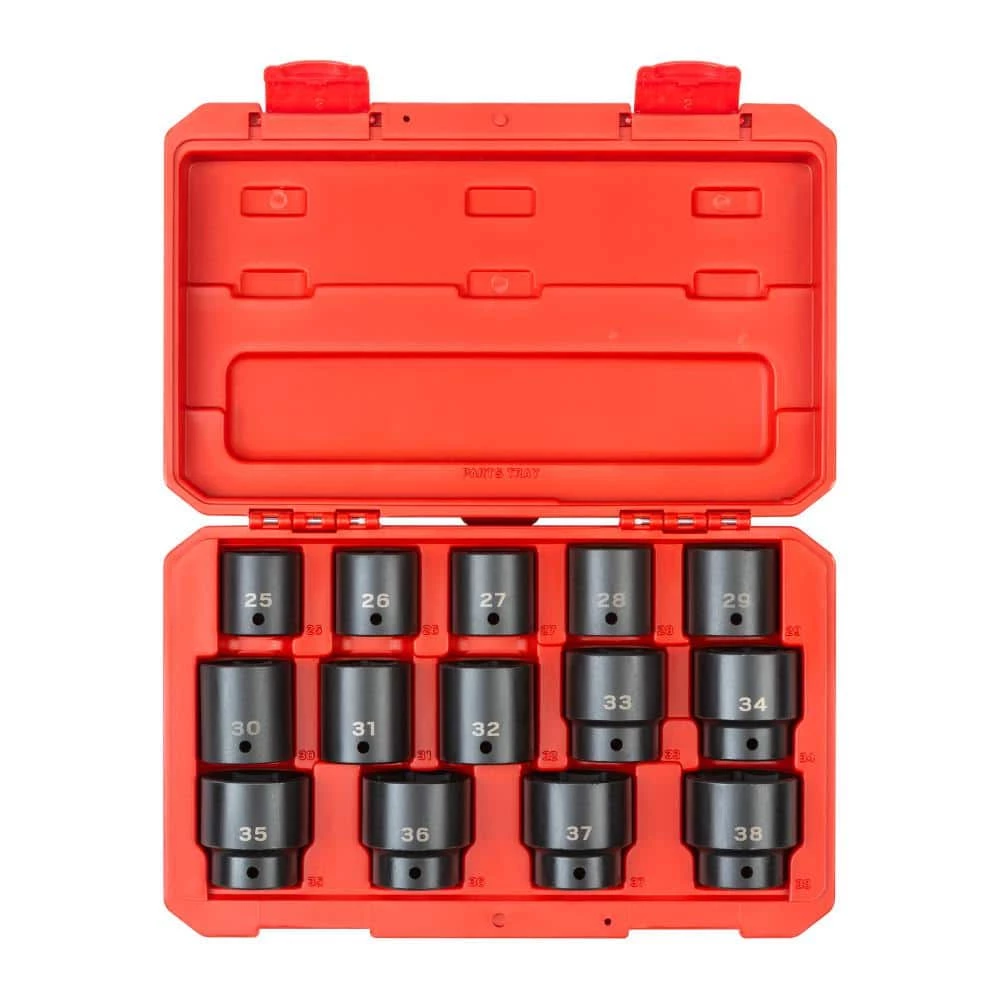 - 14-pieces 1/2 in. drive 6-point impact sockets: 25 mm, 26 mm, 27 mm, 28 mm, 29 mm, 30 mm, 31 mm, 32 mm, 33 mm, 34 mm, 35 mm, 36 mm, 37 mm, 38 mm