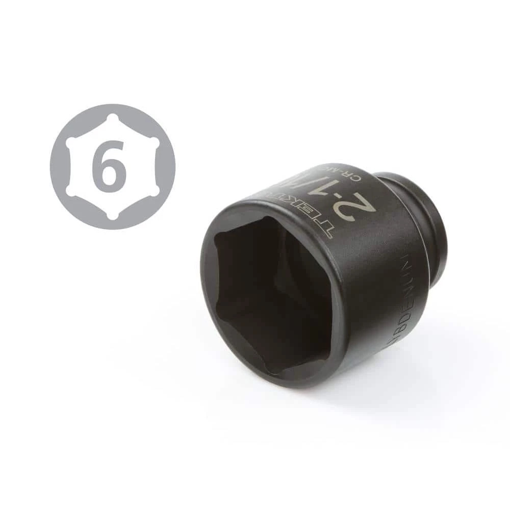 From trucks and tractors to heavy equipment and large machinery, big service and repair jobs need the TEKTON 3/4 in. Drive Shallow Impact Socket Set. Made for use with impact wrenches, these premium chrome molybdenum sockets deliver superior performance. High-torque, 6-point design contacts and grips the stronger flat sides of fastener head, not the weaker corners, to prevent stripping or round-off under extreme stress. Extra large, high-contrast size markings are permanently laser etched onto each socket, making size selection quick and easy, even in low light. A durable black phosphate finish protects from rust and corrosion. Rugged storage case keeps everything organized and easy to carry.