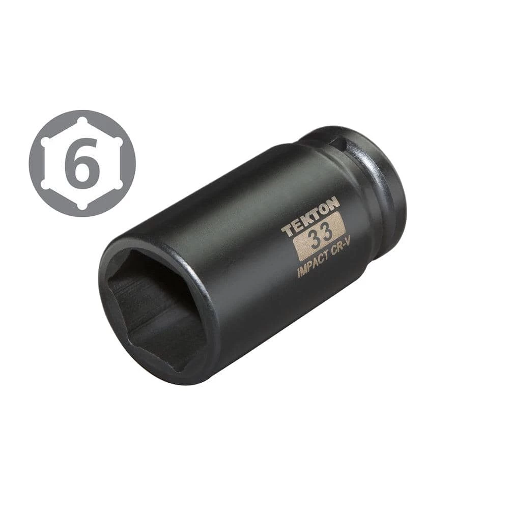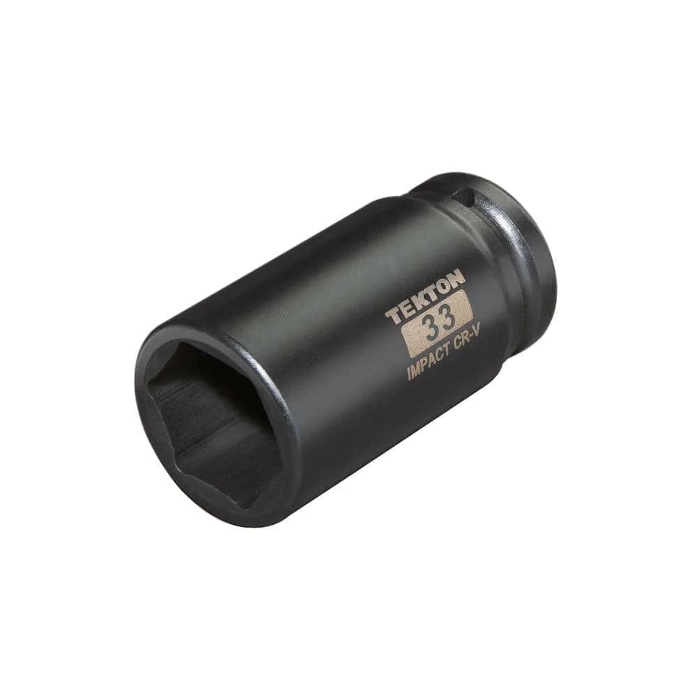 The TEKTON 3/4 in. Drive x 33 mm Deep Impact Socket is engineered for use with impact drivers. It has a 6-point opening that snugly fits the hex shape of fastener heads, allowing it to apply maximum torque without slipping. To prevent round-off under stress, it grips the flat sides of fastener heads rather than the corners. Easy to read even in low light, the large, high-contrast size marking is permanently laser etched into the steel surface. The through-hole in the drive end locks onto the tang of impact wrenches or drivers so it won’t fall off or stick on fastener heads. To protect against rust and corrosion, the black phosphate finish absorbs and holds oil, repelling moisture.