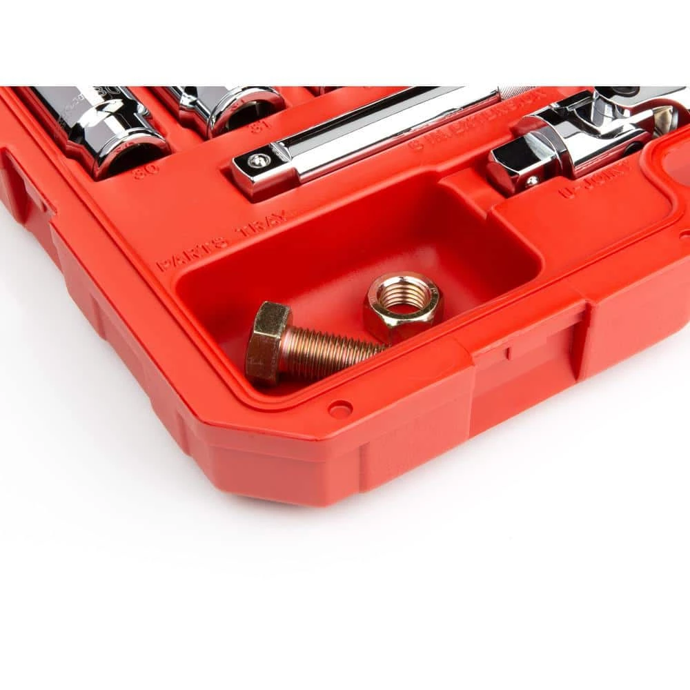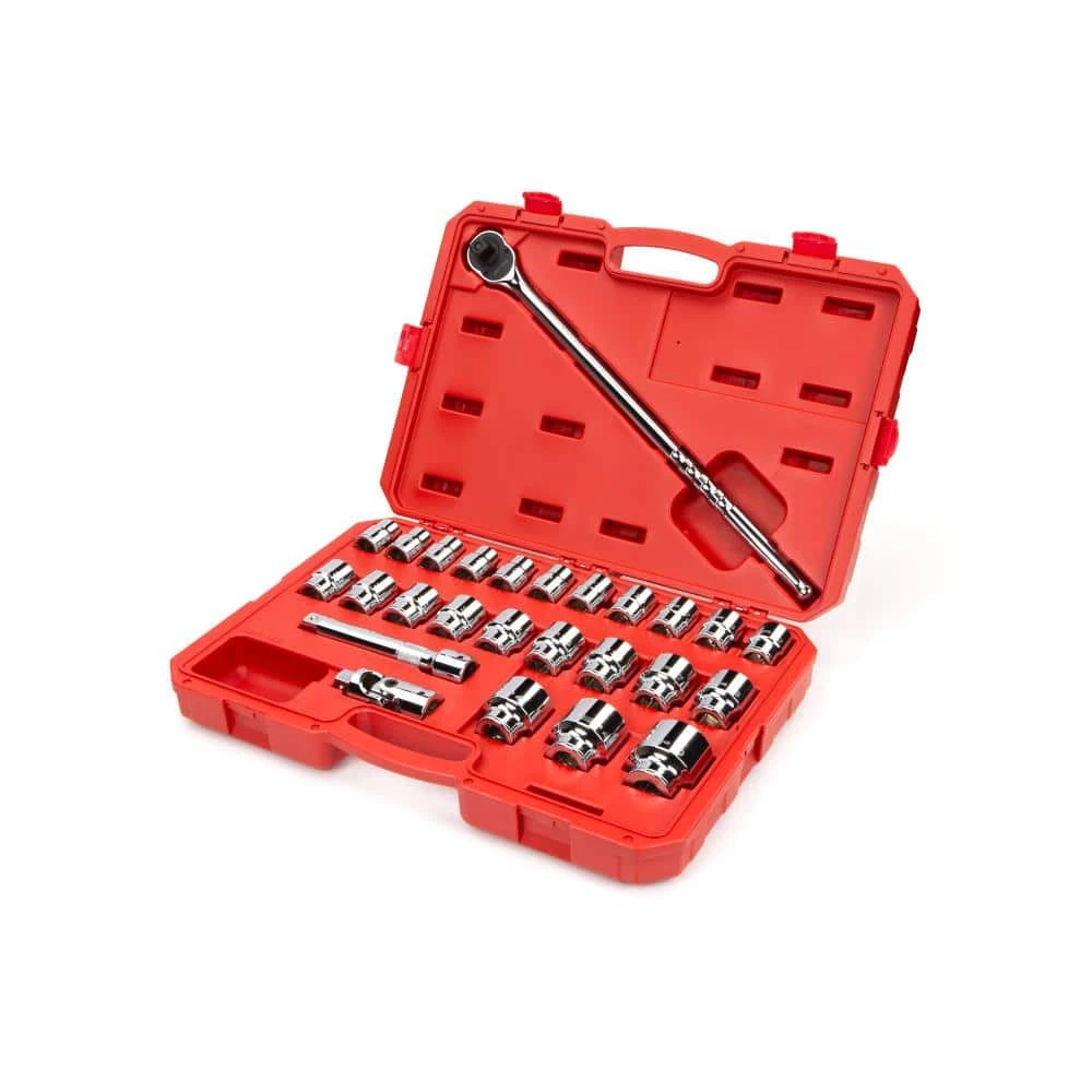 The TEKTON 3/4 in. Drive 6-Point Socket and Ratchet Set includes a range of socket sizes from 19 mm to 50 mm. The set comes equipped with a 72-Tooth quick-release ratchet as well as a universal joint and 8 in. extension, which aren’t often found in most sets. All of the tools come stored in a sturdy carrying case. The 6-point socket openings are ideal for working with hex-shaped fasteners and designed to grip the sides and not the corners of the fastener heads, preventing round-off. The large, die-stamped markings are permanently impressed into the material and optimized for readability. A mirror chrome-plated finish protects against corrosion and easily wipes clean. The TEKTON 3/4 in. drive socket system is well-suited for big service and repair jobs on heavy equipment, trucks, tractors and large machinery and consistently meets or exceeds the industry standards for socket strength and performance.