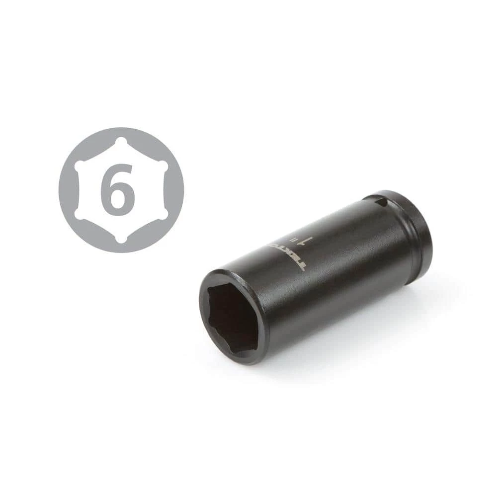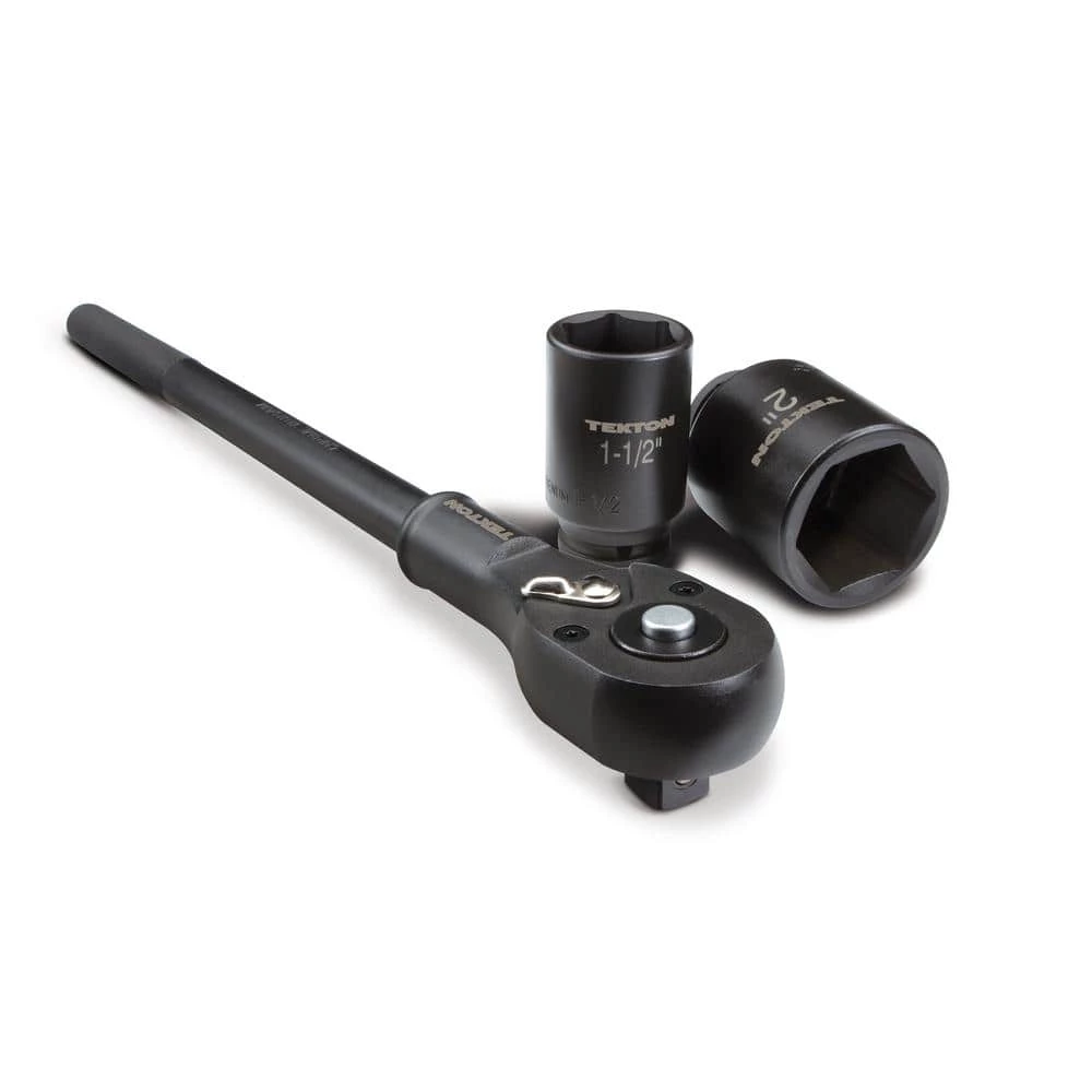 From trucks and tractors to heavy equipment and large machinery, big service and repair jobs need the TEKTON 3/4 in. Drive Impact Socket Set (22-Piece), with a range of sizes from 7/8 to 2 in. Whether you drive them with an impact wrench or by hand, these premium chrome molybdenum sockets deliver superior performance. To prevent stripping or round-off under high stress, they feature a 6-point, high-torque design that contacts and grips the stronger flat sides of nut or bolt head, not the weaker corners. Extra large, high-contrast size markings are permanently laser etched onto each socket, making size selection quick and easy, even in low light. The 18 in. 24-tooth quick-release ratchet, with non-slip knurled handle, locks onto sockets so they will not stick to fastener or fall off. To loosen frozen fasteners, grab the 18 in. breaker bar. Its sliding T head can be positioned at any point for maximum two-handed leverage. All parts are protected by a durable, corrosion-resistant black phosphate finish, and store in a heavy duty carry case.
