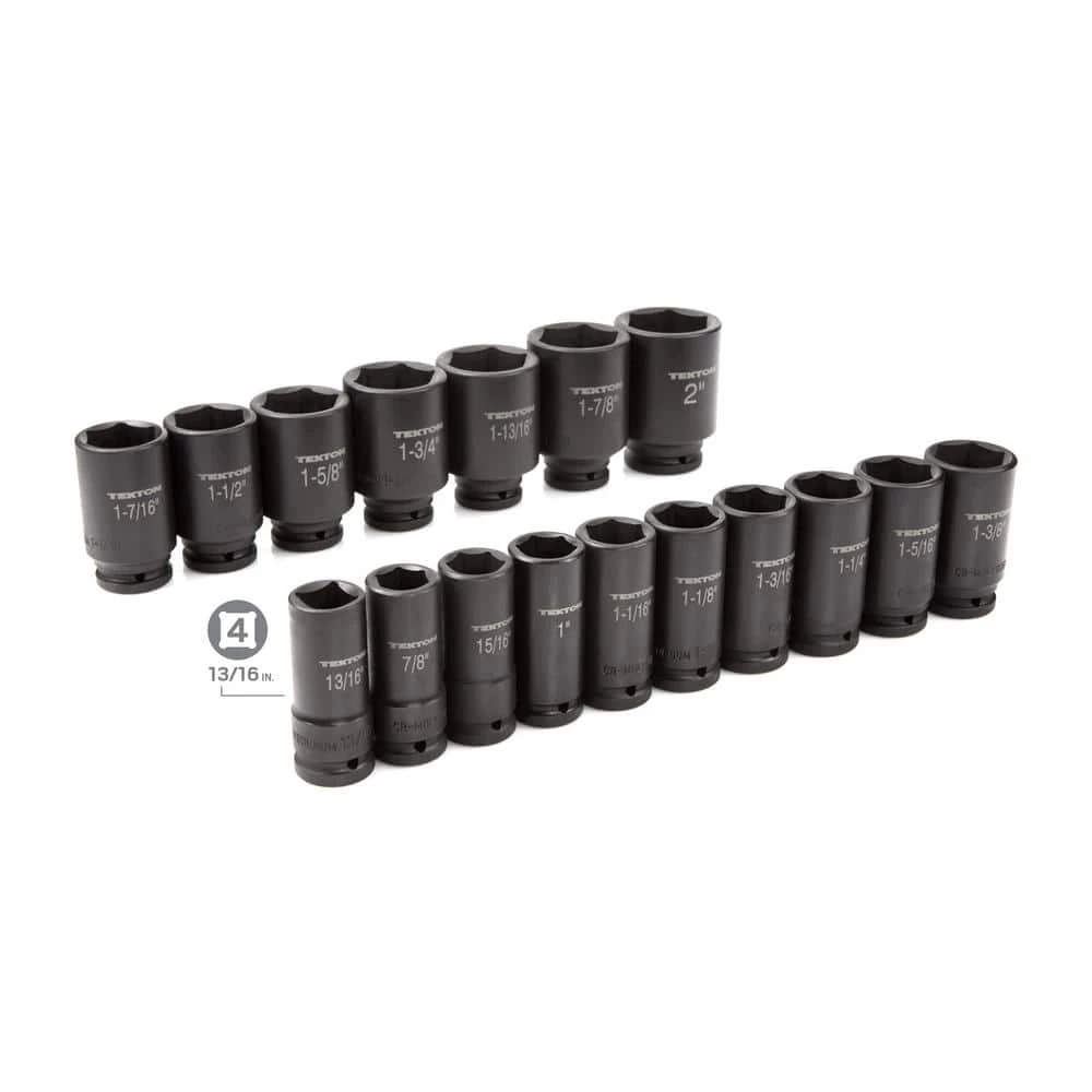- Set includes: 16-piece 3/4 in. drive impact sockets: 7/8, 15/16, 1, 1-1/16, 1-1/8, 1-3/16, 1-1/4, 1-5/16, 1-3/8, 1-7/16, 1-1/2, 1-5/8, 1-3/4, 1-13/16, 1-7/8, 2 in.