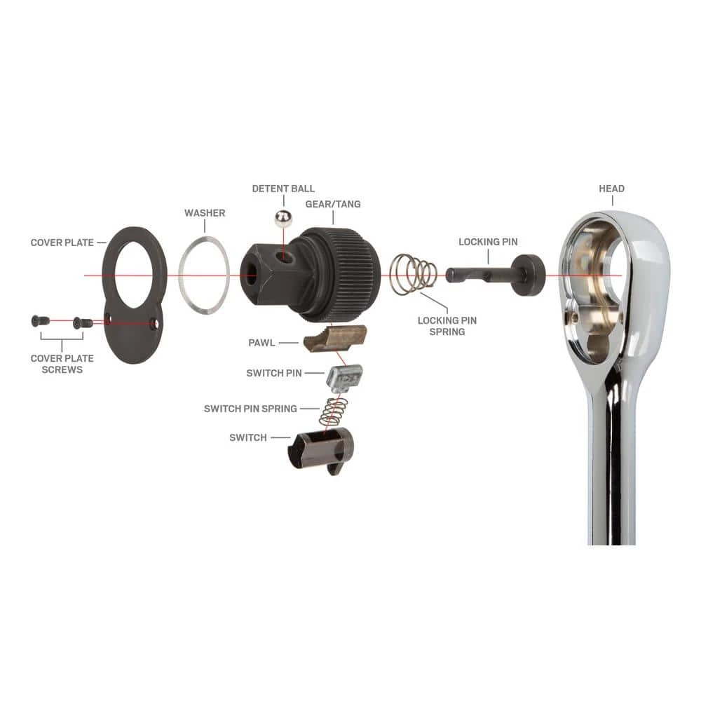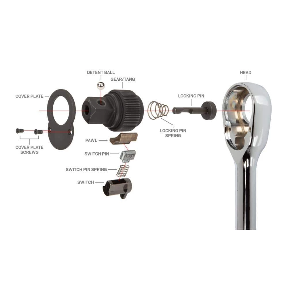 - Biased drive direction switch ensures the ratchet gear is engaged at all times, preventing slips or free-wheeling