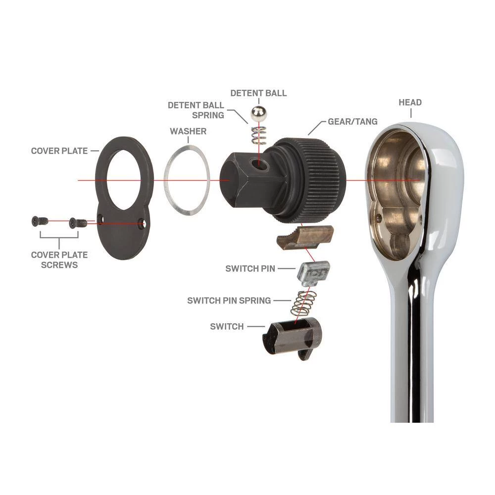 - Biased drive direction switch ensures the ratchet gear is engaged at all times, preventing slips or free-wheeling
