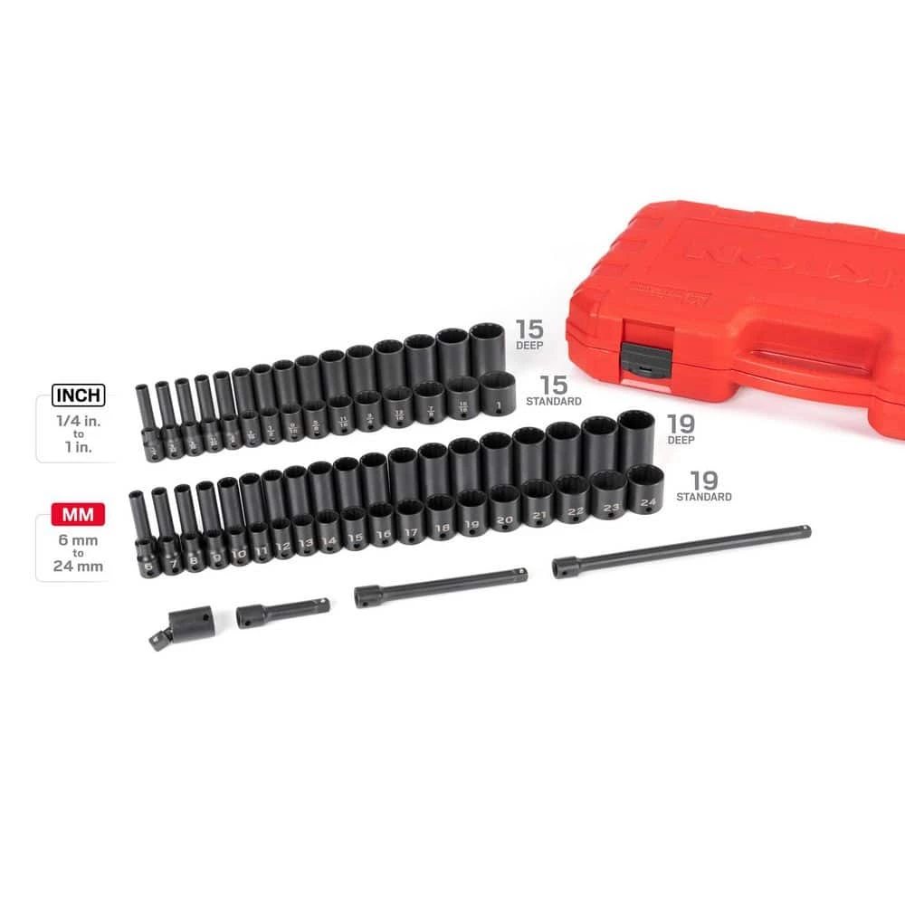 - 19-pc. 3/8 inch drive deep 12-point impact sockets: 6, 7, 8, 9, 10, 11, 12, 13, 14, 15, 16, 17, 18, 19, 20, 21, 22, 23, 24 mm