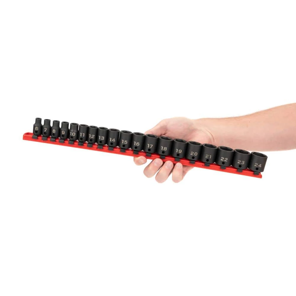 - 19-pieces, 3/8 in. drive 6-point impact sockets: 6 mm, 7 mm, 8 mm, 9 mm, 10 mm, 11 mm, 12 mm, 13 mm, 14 mm, 15 mm, 16 mm, 17 mm, 18 mm, 19 mm, 20 mm, 21 mm, 22 mm, 23 mm, 24 mm