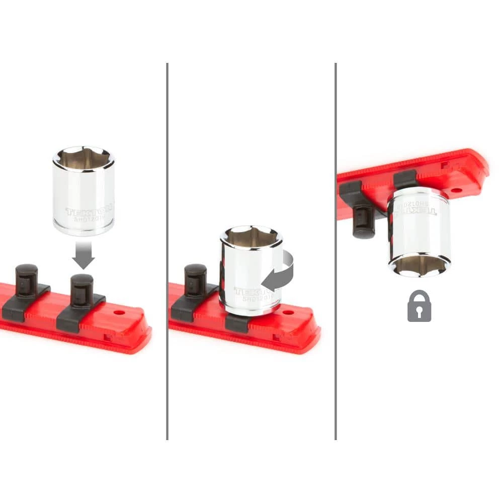 A 6-point socket opening is ideal for hex-shaped fastener heads because it contacts the most surface area of the steel. This exact fit makes the tool less likely to slip or fail, especially when you’re applying a lot of force or working with damaged or rusted fasteners. The socket opening’s radiused corners prevent round-off by gripping fasteners on their flat sides, and not their corners. Die-stamped markings are permanently impressed into the steel and can’t wear off. They’re designed with large, clear size numbers that are easy to read even in low light settings. The polished chrome plating protects against corrosion and wipes clean to a mirror finish. The deepest parts of the socket well, where nickel and chrome layers cannot be deposited in sufficient thickness, are protected with an additional thin layer of clear coat, rather than conventionally-used silver paint, to prevent rust. Four detent grooves provide a secure connection with the retaining ball of a drive tool. Radiused corners reinforce the drive end by eliminating sharp angles that are prone to cracking under stress. The drive end’s beveled edge helps guide a ratchet tang smoothly onto the socket. The patented twist-to-lock rail system organizes and securely holds sockets in place―both for in your toolbox and on the go. A quick twist of the socket locks it onto the rail so that it can’t fall off.
