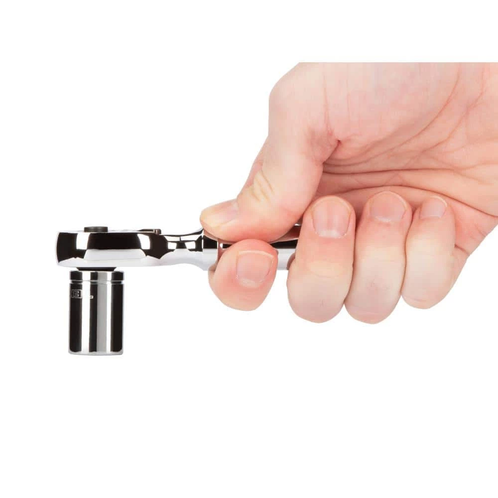 With a 90-tooth gear that produces a working swing arc of just 4 degrees, the Tekton 3/8 Inch Drive x 4-1/2 Inch Quick-Release Ratchet doesn’t need much room to operate. Combined with an ultra-compact head and stubby-length handle, it can get the job done in tight spaces where most other ratchets simply can’t fit. Sleek and simple handle design offers comfort and control in a variety of hand positions.