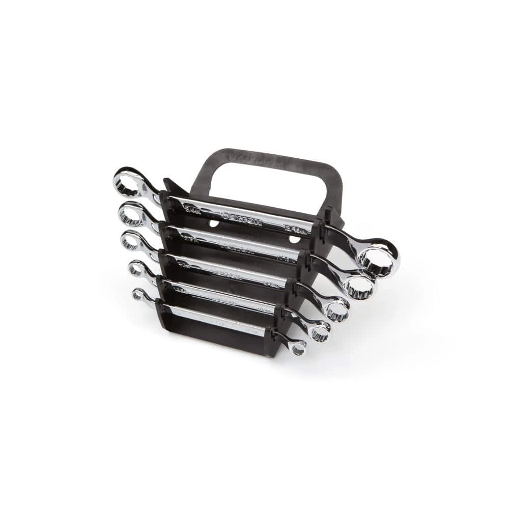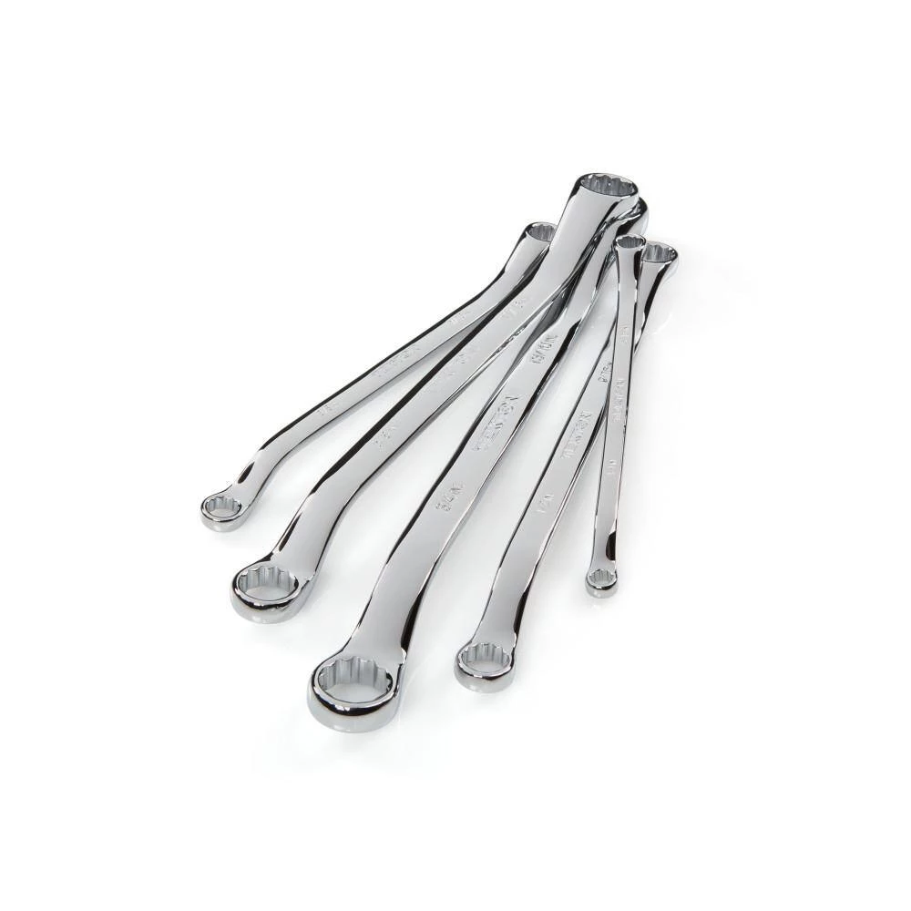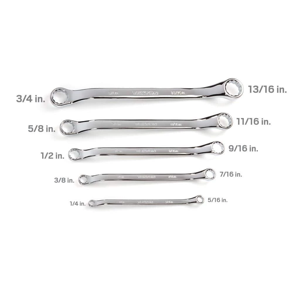 - 5-pc. offset box end wrenches: 1/4 in. x 5/16 in., 3/8 in. x 7/16 in., 1/2 in. x 9/16 in., 5/8 in. x 11/16 in., 3/4 in. x 13/16 in.
