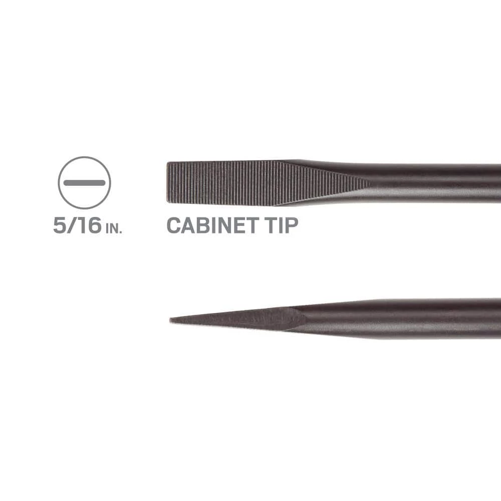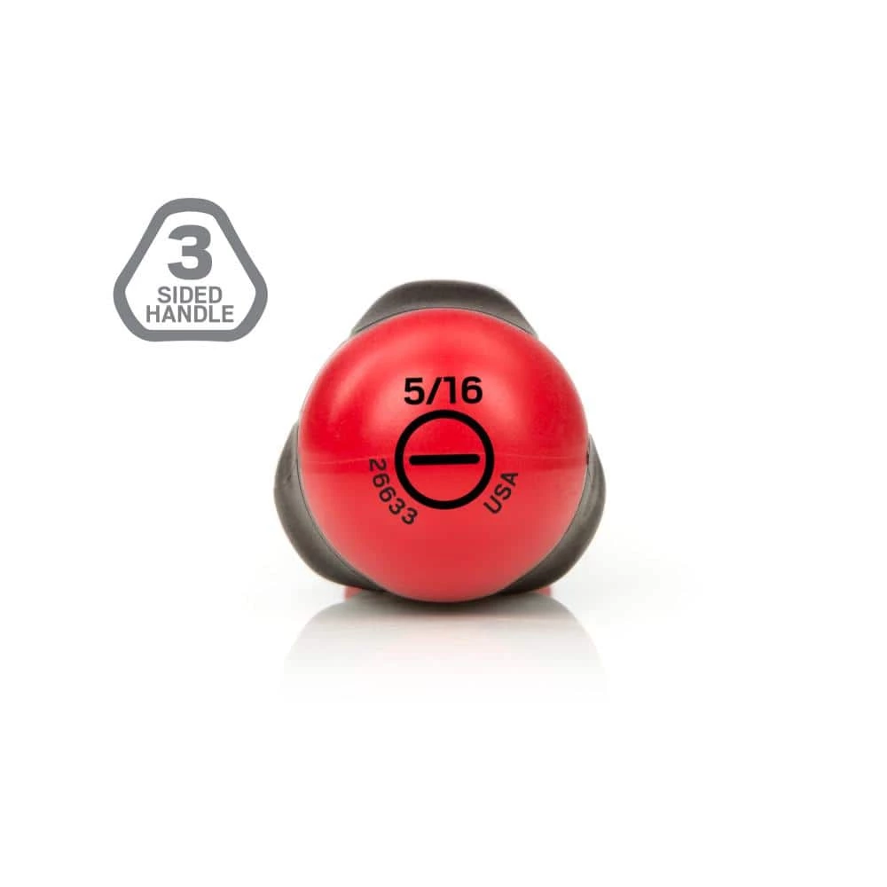 Combine power and speed with the unique handle of the TEKTON 5/16 in. Slotted x 4 in. Screwdriver. The handle relies on three-sided geometry, not just friction against your skin, giving you the comfortable leverage to break stubborn fasteners loose. For easy installation and assembly work, rounded top and bottom sections let your fingertips spin long fasteners quickly. The blade is made of premium chrome molybdenum steel and is strengthened through an exacting heat treating process. Rather than a layer of plating, the steel surface of the blade is directly treated with a hot black oxide finish-the same process used to protect firearms. This finish can’t flake off, and it preserves the precisely sized tip for an exact fit in fasteners over time. The butt end has a clear size marking that is easy to identify in your tool belt or chest drawer.