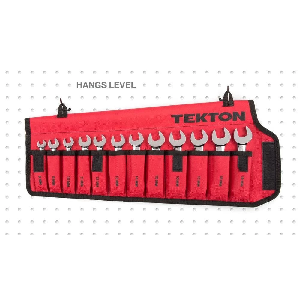 The TEKTON 12-pc. Stubby Combination Wrench Set is a complete series of every size from 8 to 19 mm. Short lengths and slim bodies make these wrenches easy to operate when there’s not much room to work. To reduce the working swing arc, the open end is angled 15 degrees so the wrench can be flipped over with each rotation to engage the fastener twice as often. The 12-point box end doubles the access angles of a 6-point. It’s offset 15 degrees, creating clearance for your fingers and extra space to slide past whatever might be in the way. To prevent round-off, it contacts and applies force to the flat sides of fastener heads rather than the corners. The wrenches are compactly organized in a premium roll-up storage pouch with a tailored cover that keeps them from sliding out when you’re on the move. To prevent scratches on finished surfaces, the pouch has fabric hanging loops rather than metal grommets.