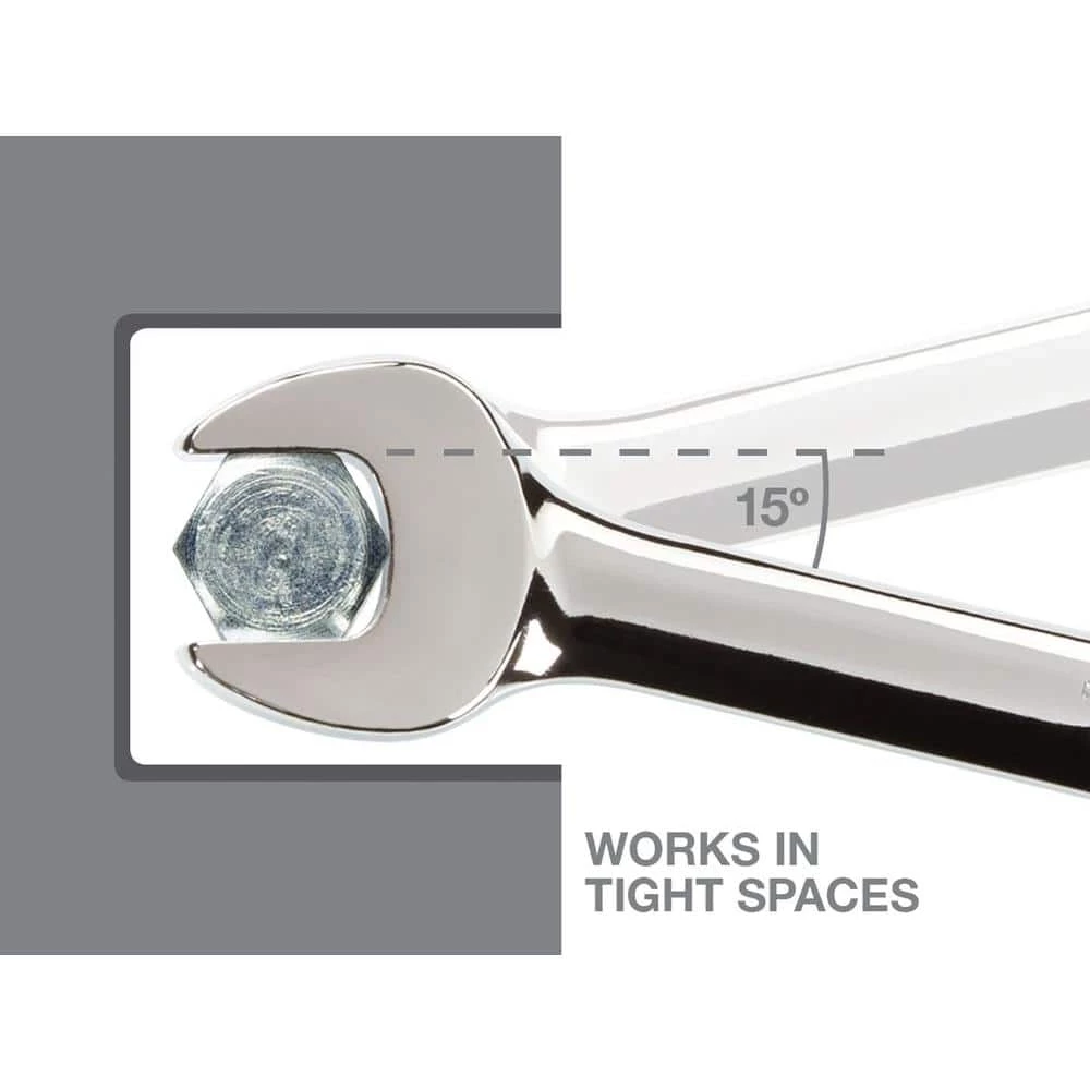 - Open end is angled 15° so it can flip over and engage fasteners twice as often in tight spaces